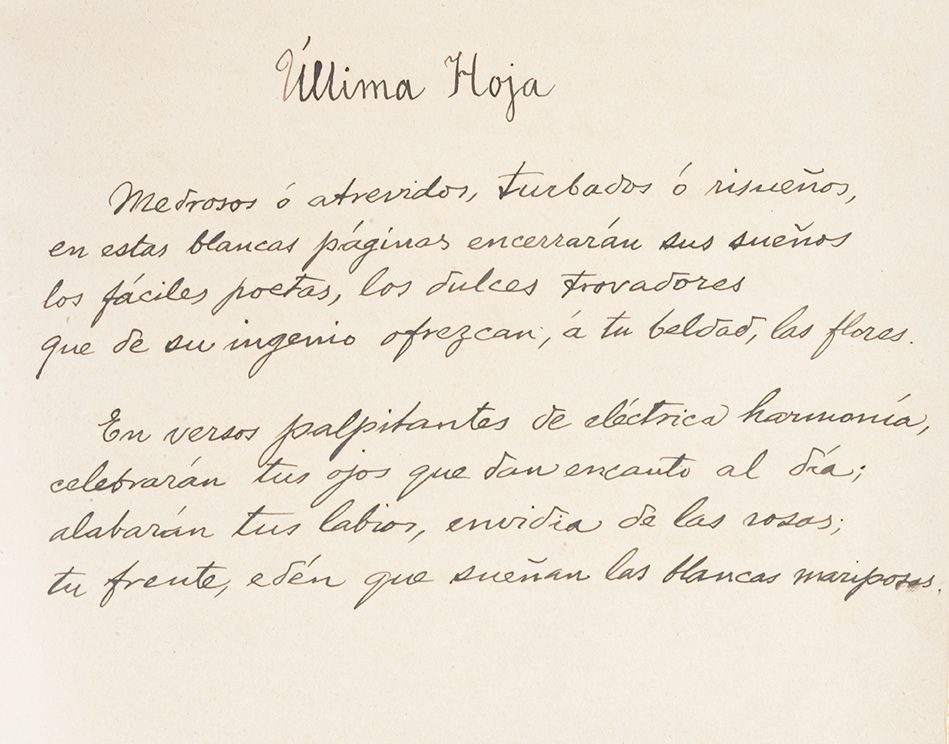 Subasta 957, Lote # 312 DA - Ruelas, Julio - Tablada, José Juan - Izaguirre, Leandro - Nervo, Amado - Montenegro, Roberto. Poemario Manuscrito Ilustrado, Dedicado a Lorencita Braniff. 1903. Ruelas, Julio - Tablada, José Juan - Izaguirre, Leandro - Nervo, Amado - Montenegro, Roberto. Poemario Manuscrito Ilustrado, Dedicado a Lorencita Braniff. 1903. 4o. marquilla, 15 h. 103 hojas utiles. Ilustrado con cuatro acuarelas. Firmado por Julio Ruelas, Justo Sierra, José Juan Tablada, Abel C. Salazar, Amado Nervo, Roberto Montenegro, Alejandro Quijano, Juan de Dios Peza, Leandro Izaguirre, Roberto Argüelles Bringas, Manuel de la Parra Luis Gonzaga Urbina, A. Pavón G. y Balbino Dávalos. Faltante en tercio inferior del poema de Roberto Argüelles Bringas y hoja siguiente, afecta texto. Pasta anterior grabada, con aplicaciones en metal; cantos dorados. Encuadernado en pasta dura, en piel. En estuche de gamuza con broche, frágil. Las acuarelas que componen este ejemplar corresponden a Julio Ruelas, en la portada, Leandro Izaguirre, en el retrato de Lorencita Barniff, y los paisajes a Roberto Montenegro y A. Pavón G. Buena parte de los autores de este manuscrito formaron parte de la Revista Moderna, el principal vehículo de divulgación del movimiento modernista en México, una corriente surgida a principios del Siglo XX con aspiraciones de renovación estética en las expresiones artísticas con impacto internacional. Cabe mencionar que Lorenza Braniff Ricard fue miembro de una familia burguesa de origen norteamericano establecida en México; su padre, Thomas Braniff, fue un reconocido hombre de negocios, responsable de la construcción del ferrocarril México - Veracruz a finales del Siglo XIX. Estimado $60,000-70,000