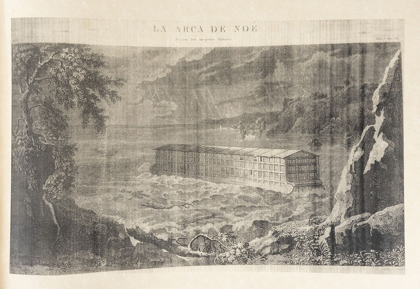 4o. marquilla apaisado, sin paginar. 34 grabados y dos facsimilares. Surcos y puntos de polilla, algunos restaurados; portada con rasgaduras, algunas restauradas; faltantes en margen inferior interno de láminas: "Altares de los Holocaustos" y "Carta del Imperio de los Persas", y en margen exterior de lámina: "Plan y Distribución de la Tierra de Chanaan". Encuadernado en pasta dura, en piel.