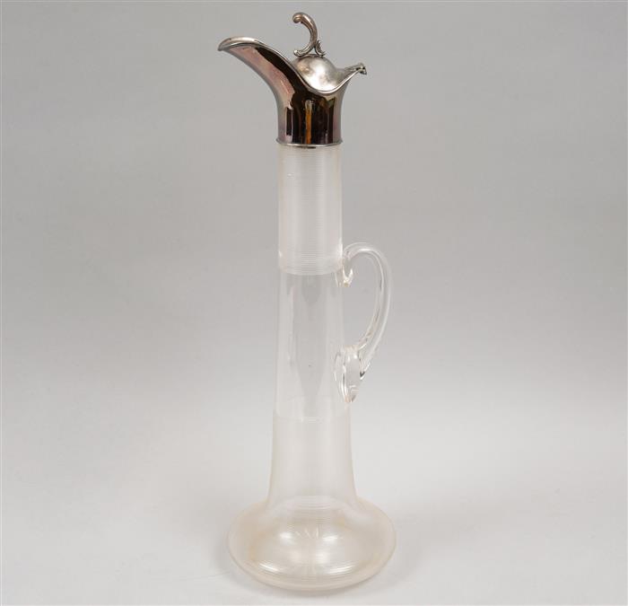 Decorados con motivos orgánicos, amorcillos y vides. Jarra con diseños anillados 51 cm de altura. Depósito con anillado para depósito interno de vidrio prensado. Depósito de metal con mascarones del dios Baco y asas anilladas. 9.5 x 16 x 14 cm
