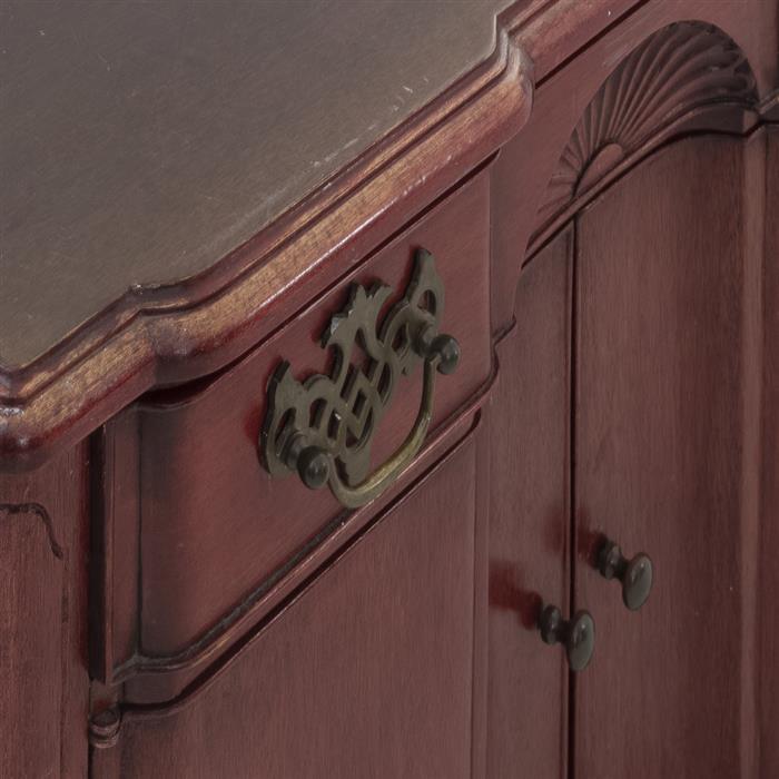 Con cubiertas irregulares, cajón con tiradores de metal dorado, 2 puertas abatibles con tiradores de metal dorado y soportes semicurvos.