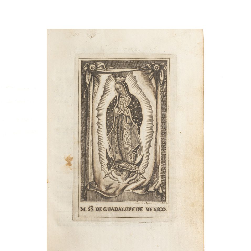Campo y Rivas, Manuel Antonio del. Compendio Histórico de la Fundación, Progreso, y Estado Actual de la Ciudad de Cartago en la Provincia de Popayán en el Nuevo Reyno de Granada de la América Meridional. Guadalaxara: En la Oficina de Don Mariano Valdés Téllez Girón, 1803. 8o. marquilla, 13 h. + X + 47 + 50 + 44 p. + 2 h. Y de la Portentosa Aparición y Renovación de la Santa Imagen de María Santísima que con el Título de Nuestra Señora de la Pobreza se Venera en el Convento de Religiosos de S. Francisco de la misma Ciudad. Dividido en tres partes. Parte Primera: Una lámina "Nuestra Señora de la Pobreza"; página 47 dice 65. Parte Segunda: Una lámina "M. SmaS. de Guadalupe de México", grabado de Franco. Agüera, Sc. á 1791. Parte Tercera: falta de lámina. Ejemplar con pátina de uso; portada fala punta superior. Pastas y lomo muy deteriorados. Encuadernado en pasta dura, en piel. Palau: 41362.