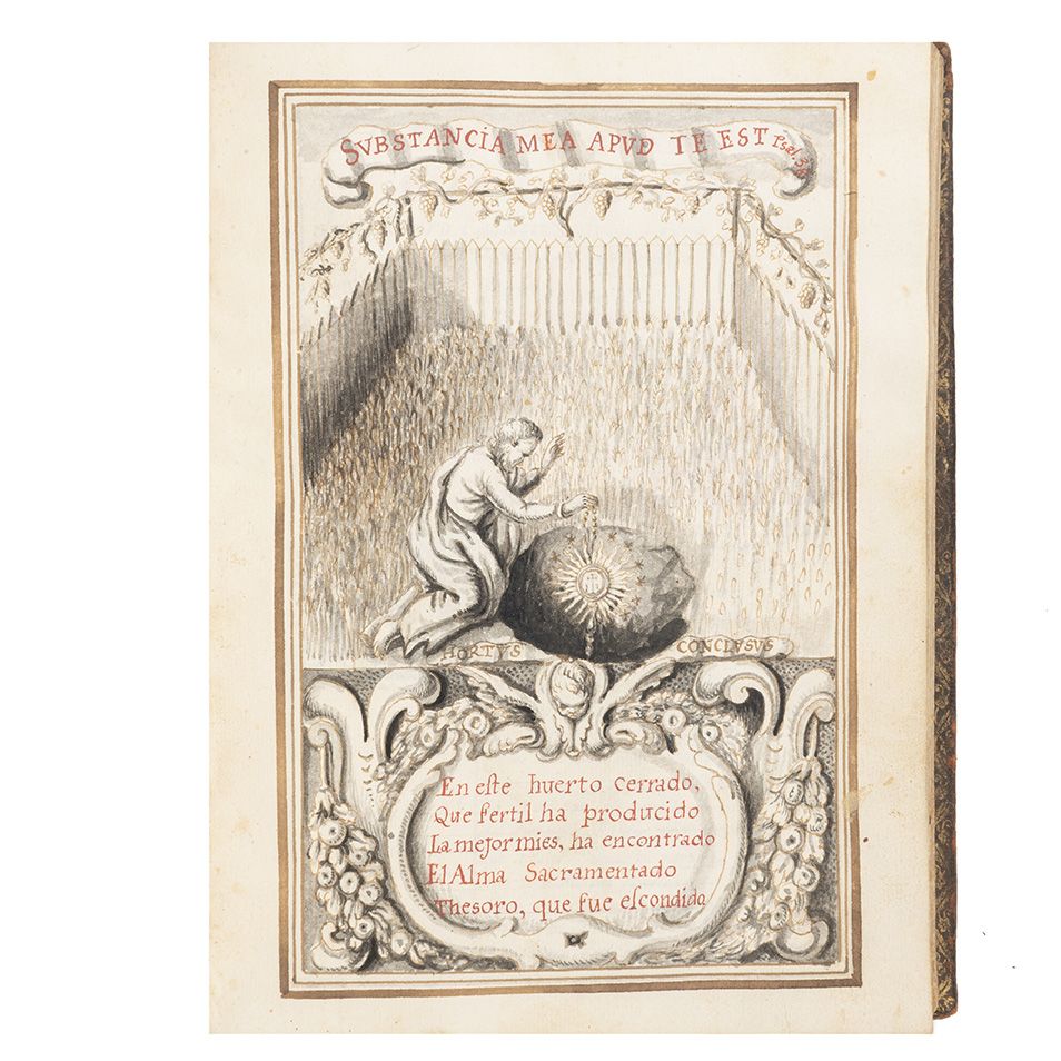 Subasta 961, Lote # 176 Coello y Espinosa, Bernardino. Autos Sacramentales de D. Pedro Calderón de la Barca. Cavallero del Orden de Sanctiago, y Capellán de Honor de las Mag. Catholicas D. Phelipe IIII y D. Carlos Segundo. Dedicase a el Mvi Alto i Venerado Sacramento de la Evchariftia Milagro de los Milagros de Amor. Por D. Bernardo Cöello de Aguirre y Efpinofa, quien lo efcrivia, y reducia a Tomo, que contiene doze Avtos. En Madrid. Año de M.D.CC.XV. 8o. marquilla, sin paginar. Manuscrito. Autos: El Valle de la Zarzuela, Andrómeda y Perseo, La Cura y la Enfermedad, No hay fortuna que Dios, Siquis y Cupido, El Tesoro escondido, El Arca de Dios captiva, Al Prójimo como a ti, La Serpiente de Metal, El Pleito Matrimonial, La Lepra de Constantine, El Orden de Mechisedech. Un dibujo por cada auto. Encuadernado en pasta dura, en piel. Citado en: Gallardo, Bartolomé José. "Ensayo de una Biblioteca Española de Libros raros y Curiosos". Madrid: Imprenta y Estereotipia de M. Rivadeneyra, 1863. Tomos I - IV. "1534. Ms. En 4º con el retrato de Calderón en vitela iluminada, y un dibujo a cada auto". Estimado $24,000-28,000