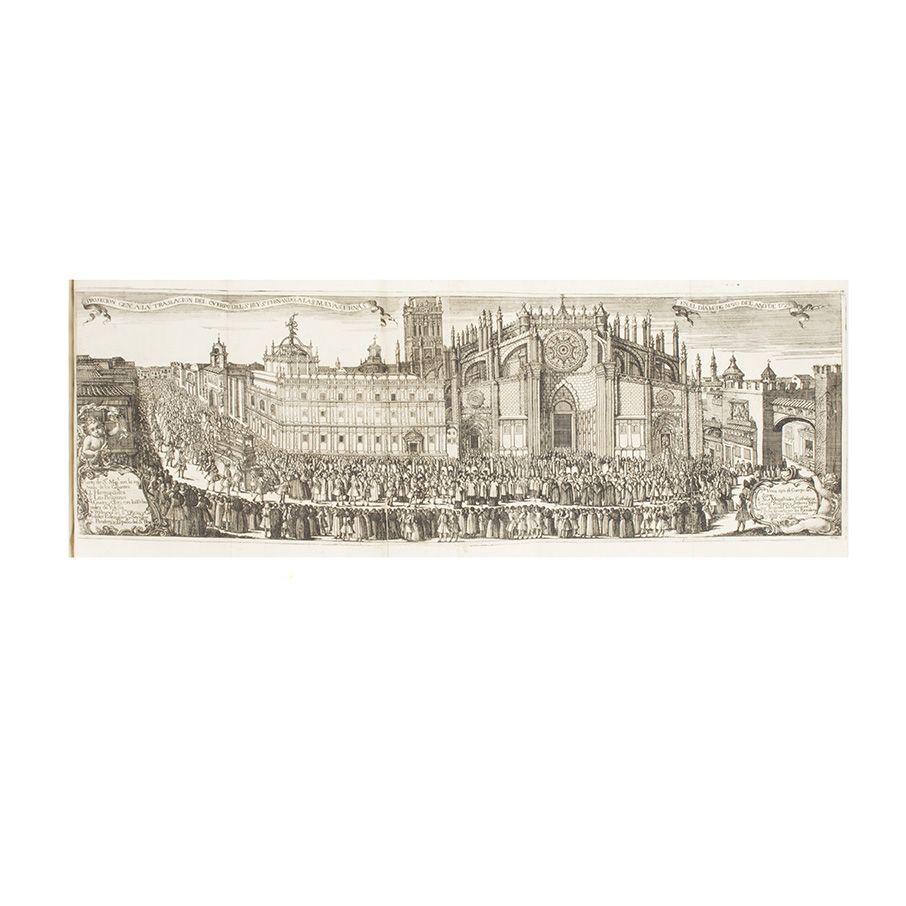 Subasta 961, Lote # 164 Zúñiga, Lorenzo Baptifta de. Annales Eclesiásticos y Seglares de la M. N. i M. L. Civdad de Sevilla que Comprehenden la Olimpiada o Lvstro de la Corte en ella; Con dos Apéndices vno desde el año de 1671 hasta el de 1728. I otro desde 1734 hasta el de 1746. Sevilla: En la Imprenta de D. Florencio Jofeph de Blas y Quefada, Imprefform Mayor de dicha Ciudad, sin año. 4o. marquilla, 26 h. + 250 p. + dos grabados plegados. Dados a la prensa por acuerdo de la misma ciudad que los dedica a la majestad del Rei San Fernando, nuestro señor. El autor consta en la "Licencia" y en la "Tassa": "… compuefto por fu Contador D. Lorenzo Baptifta de Zúñiga…". Los grabados por Pedro Toledo. El primero muestra la entrada de Felipe V a la ciudad de Sevilla en febrero 3 de 1729, el segundo es el traslado del cuerpo de Fernando III, Santo Castillo de León en mayo 4 de 1729. Surco de polilla en margen superior, paginas 129 - 223, no afecta texto. Encuadernado en pasta dura, lomo y puntas en piel. Palau: 11660: "Excelente edición. Según Matute y Gaviria el autor de esta obra fue el P. Antonio de Solís, de la Compañía de Jesús. Nosotros la describimos en la primera edición de este Manual, bajo la rúbrica de Zúñiga (Lorenzo de Baptista) que es el seudónimo de su autor.". En esta obra se presenta el cuadro de la época en que Felipe V tuvo su corte en la capital de Andalucía, sin cuya adhesión no habría ostentado la Corona. Compuesta de dos apéndices: el primero, desde el año 1671, fecha en que finalizan los Anales de Ortiz de Zúñiga, hasta 1728, año en que se instauró la Corte en la capital de Andalucía; y el segundo, desde 1734, en que salió la corte de allí, hasta 1746. Estimado $20,000-24,000