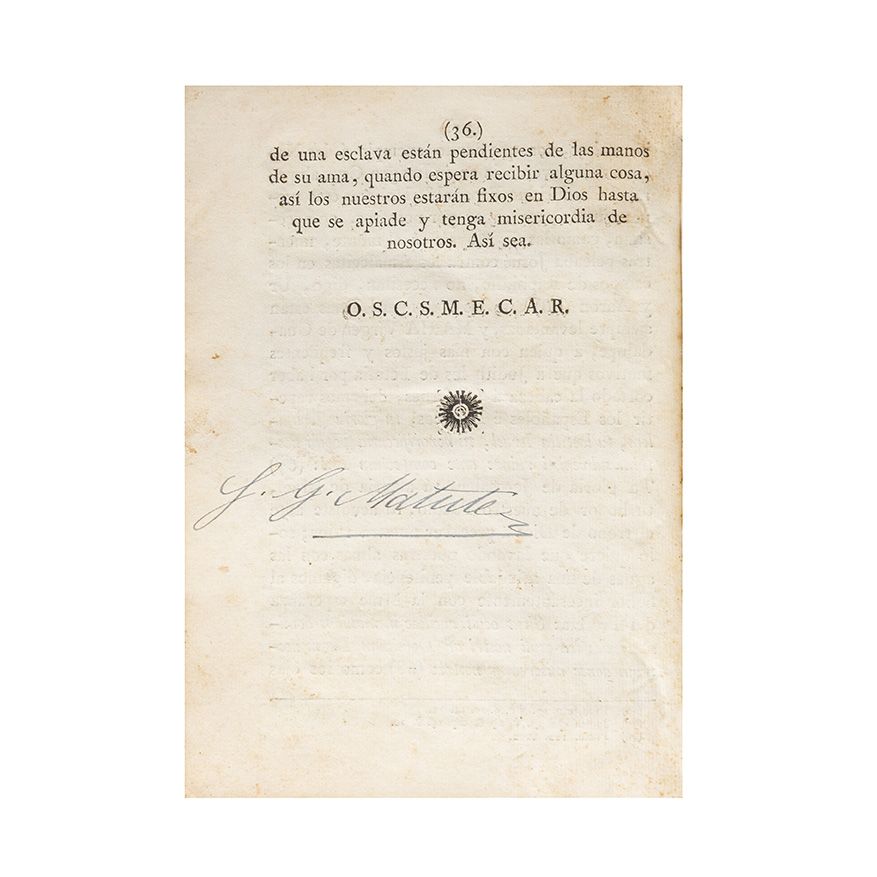 Subasta 961, Lote # 113 Solano y Marcha, Joseph María. Sermón Moral que en la Rogación Solemne Hecha por los Cuerpos Militares de la Guarnición Mexicana, para Implorar los Auxilios del Todo-Poderoso mediante la Intercesión de María Santísima de Guadalupe a favor de las Armas de España en la presente Guerra contra la Francia. México: Impreso en la Oficina de Don Mariano Joseph de Zúñiga y Ontiveros, 1795. 8o. marquilla, 5 h. + 36 p. Predicó en la Iglesia de su Insigne y Real Colegiata, con el Evangelio de nuestra Señora de Belén, y expuesto el Señor Sacramentado, la Domínica tercera después de la Epifanía, día 25 de Enero de 1795. Un grabado "Escudo de Armas" del 53o. Virrey de la Nueva España, Miguel de la Grúa Talamanca y Branciforte. 1er. Marqués de Branciforte. Firmas de antiguo propietario en portada, al reverso de la lámina y en última página. Encuadernado en pasta dura, en piel. Estimado $10,000-12,000