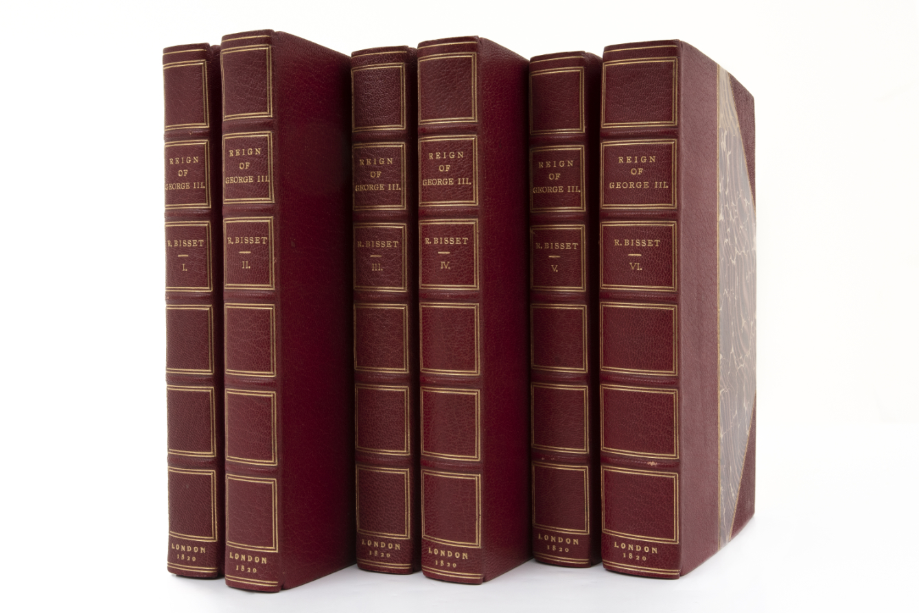 Subasta 973, Lote # 17 Bisset, Robert. The History of the Reign of George III to which is Prefixed, a View of the Progressive Improvement of England, in Prosperity and Strength (sic), to the Accession of his Majesty. London: Printed for Longman, Hurst, Rees, Orme, and Brown, 1820. 8o. marquilla, XXIV + 460; XII + 474; XVI + 478; XIX + 494; XV + 640; XIX + 485 p. Tomos I - VI. Segunda edición. Ex libris de Andrew Carnegie. Encuadernados en pasta dura, lomo y puntas en piel. Piezas: 6. Estimado $7,000-9,000
