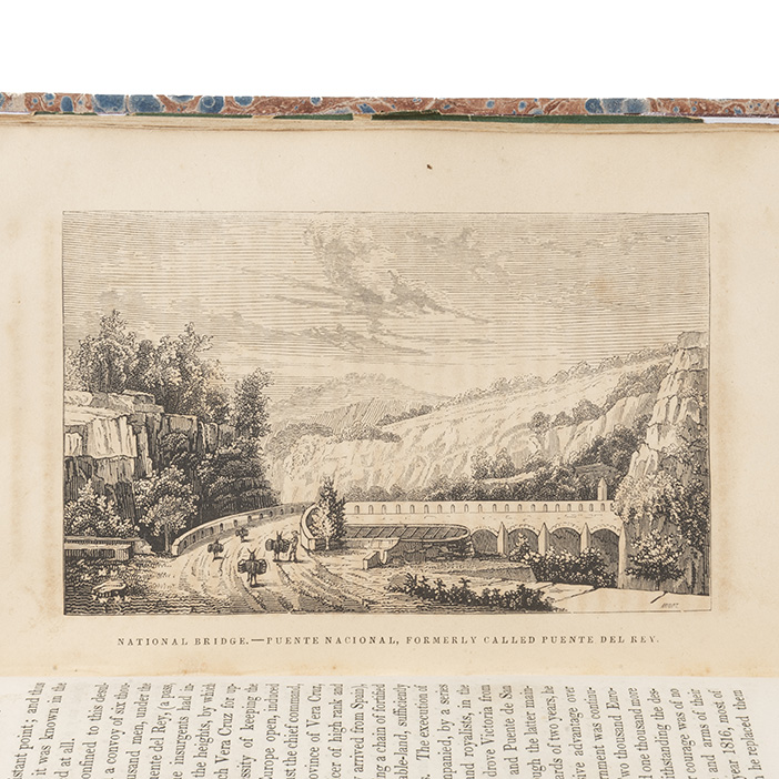 Subasta 986, Lote # 227 Robinson, Fayette. Mexico and her Military Chieftains, from the Revolution of Hidalgo to the Present Time. Comprises Sketches of the Lives of Hidalgo, Morelos, Iturbide, Santa Ana, Gomez Farias, Bustamente, Paredes, Almonte, Arista, Alaman, Ampudia, Herrera, and De la Vega. Philadelphia: Published by E. H. Butler & Co., 1847. 8o. marquilla, 343 p. Frontispicio y once láminas. Primera edición. Texto con ligera mancha de humedad, nombre de antiguo propietario en frontispicio. Encuadernado en pasta dura, lomo en piel. Palau: 271084. "Robinson narró las causas y las campañas principales, presentó biografías breves de varios oficiales generales y cubrió los esfuerzos para poner fin a la guerra a través de la diplomacia". Véase en: Kurutz, F. Gary - Mathers, W. Michael. The Conflict Between Mexico and the United States, 1846 - 1849... California: California of the State Library, 2003. Pág. 165. Incluye un relato del combate de la Armada de Texas bajo el mando de E.W. Moore y la Armada de México frente a Campeche en abril de 1843. Esta fue la primera vez que barcos de vapor y vela habían estado en combate entre ellos. Estimado $5,000-7,000