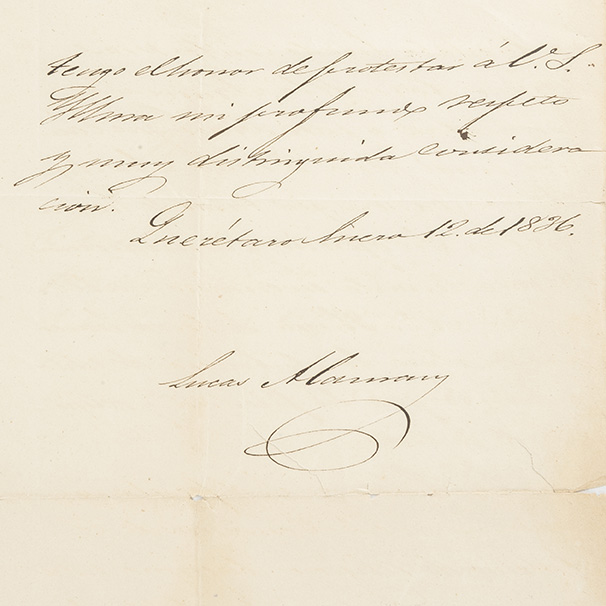 Alamán, Lucas. Carta Dirigida al Ilustrísimo Sr. Cabildo Gobernador de este Arzobispado. Querétaro, enero 12 de 1836. Firma.