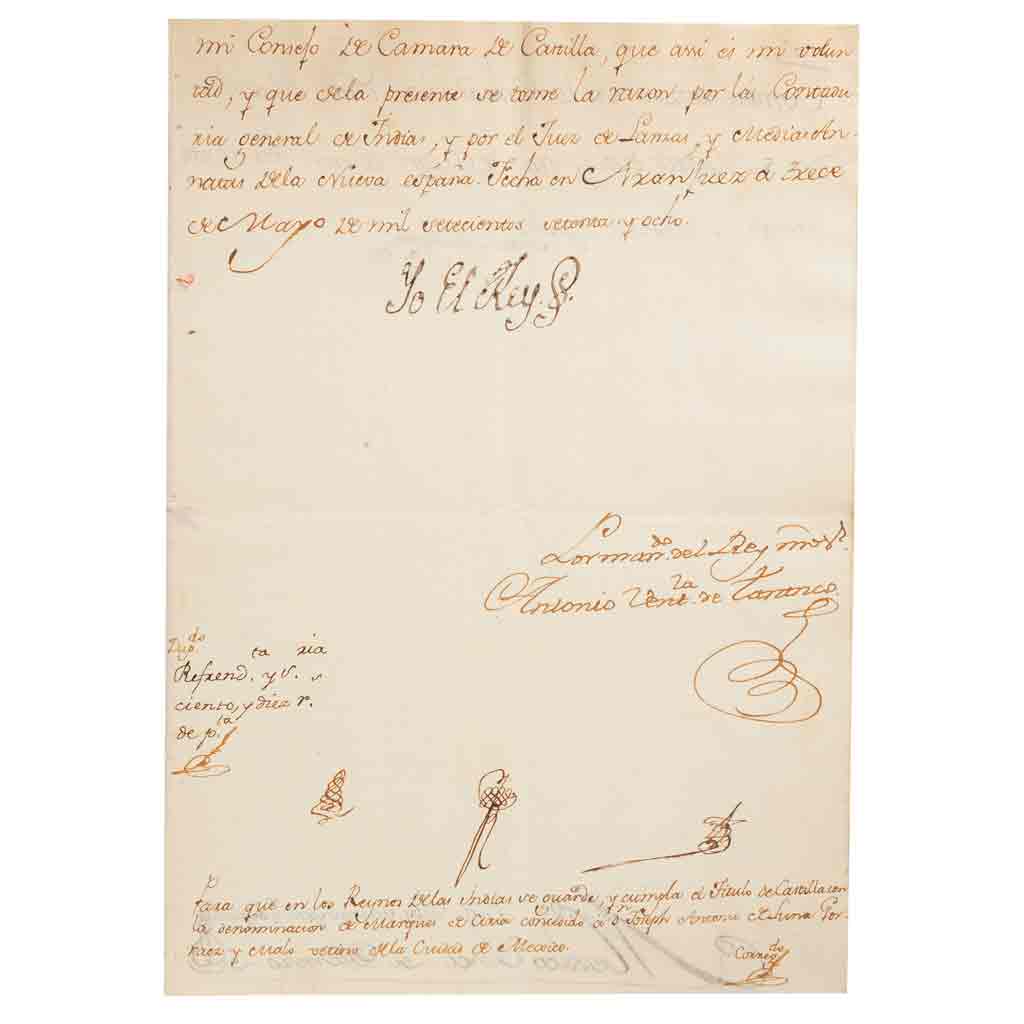 Subasta 986, Lote # 196 Carlos III / Bucareli y Urzúa, Antonio / Marqués de Ciria. Documentos Relativos al Título de Marqués de Ciria a D. Joseph Antonio de Luna Gorraez y Malo. a) Carlos III. Real Cédula Auxiliatoria: Título de Castilla con la Denominación de Marqués de Ciria a D. Joseph Antonio de Luna Gorraez y Malo. Aranjuez, mayo 13 de 1778. "Por quanto por parte de Dn. Joseph Antonio de Luna Gorraez y Malo, Mariscal de Castilla y Alguacil mayor del Tribunal de cuentas de la Ciudad de México, se me ha representado que aviendo tenido a bien conceder quatro Títulos de Castilla para los naturales de la Nueva España con motivo del plausible y feliz parto de la primera mi muy cara y amada Nuera acaecido el año de mil setecientos setenta y uno, recayó uno de ellos en un padre Dn. Joseph Pedro de Luna que avia fallecido sin aver usado de esta gracia". Firma del Rey Carlos III. Firma de Francisco Machado, de la Contaduría General de las Indias en Madrid, con fecha del 16 de mayo de 1778. 4 h. (dos útiles), 29.8 x 21 cm. Manuscrito. b) Bucareli y Urzúa, Antonio. Obedecimiento del Título de Castilla. México, enero 23 de 1779. "Cúmplase lo que su magestad manda en el presedente Real Despacho, por el que se sirve conceder merced de Tittulo de Castilla, con la denominación de Marqués de Ciria a Don Jossé Antonio de Luna, para sí, sus hijos, herederos, y subcesores; y asentado en los Libros del Oficio de mi Superior Gobierno, a que toca, tomada razón en la Contaduría de Media Annata entréguese original al interesado para su uso". Firma de Phelipe Francisco Oton Passatte. 4 h., 30.8 x 21 cm. Manuscrito. c) Marqués de Ciria. Recibo de Réditos. México, 13 de abril de 1809. "Como Tesorero de la M. Ilte. Archocofradía de Cavalleros de la Sta. Veracruz, he recibido de D. Bruno Larrañaga, Tesorero de la N. Ciudad la cantidad de 20 V. por un año de réditos cumplido en once de marzo del presente del principal de quatrocientos, que reconoce, procedentes de la Casa que se destruyó para ubicar el Mercado de la Plazuela". Firma del Mariscal de Castilla, Marqués de Ciria. 1 h., 15.3 x 21.4 cm. Manuscrito. Total de piezas: 3. Ante la muerte de José Pedro de Luna, el rey puso en manos de su hijo, José Antonio de Luna Gorraez, elegir la denominación del título. Fue este último quien ostentó por primera vez el título de Marqués de Ciria, que hace referencia al municipio de Ciria, provincia de Soria, el 18 de septiembre de 1777. En la Real Cédula Auxiliatoria de 1778, el rey Carlos III extiende la validez del título a los Reinos de las Indias. Estimado $20,000-25,000