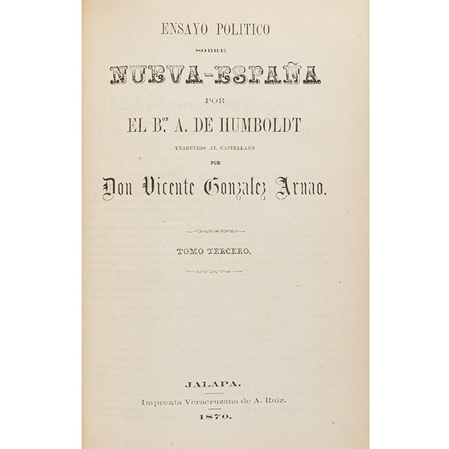 Subasta 1004, Lote # 204 Humboldt, Alejandro de. Ensayo Político sobre Nueva España. Jalapa: Imprenta Veracruzana de A. Ruiz, 1869 - 1870. 4o. marquilla, X + 393 p. + 1 h. + 382 p. + 2 h. + 155 p. + 2 h. Tomos I - III, en un volumen. Traducción al castellano por Don Vicente González Arnao. Encuadernado en pasta dura. Palau: 116982. Reimpresión de la tercera edición de la traducción de Arnao. Obra dividida en 6 secciones: Consideraciones generales sobre la extensión y geografía de la Nueva España, Población en general, con noticias sobre la división en castas, Estadística particular de cada intendencia, Estado de la agricultura y minería, Progresos de la manufactura y el comercio, y finalmente, Indagaciones sobre las rentas del Estado y sobre la defensa militar del país. Estimado $8,000-10,000