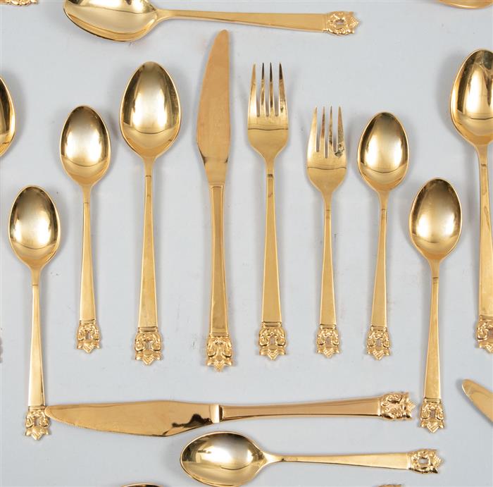 Consta de: 6 cuchillos para carne, 6 tenedores para carne, 6 cuchara para sopa, 6 tenedores para ensalada, 6 cucharas para postre y 6 cucharas cafeteras.