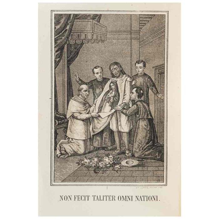 Subasta 1008, Lote # 228 Por un Sacerdote / Ripalda, Gerónimo - Palma, Miguel Trinidad. La Virgen del Tepeyac / Catecismo de la Doctrina Cristiana. a) Por Un Sacerdote. La Virgen del Tepeyac Patrona Principal de la Nación Mexicana, Compendio Histórico Crítico. Guadalajara: Tip. de Ancira y Hno., 1884. 8o. marquilla, 368 p. + 1 h. Una lámina. Dedicado y firmado por antiguo propietario. Pastas con manchas de humedad y pequeños faltantes; lomo deteriorado con faltantes. Encuadernado en rústica. b) Ripalda, Gerónimo - Palma, Miguel Trinidad. Catecismo de la Doctrina Cristiana. Puebla: Imprenta de M. Corona, 1886. 16o. marquilla, 114 p. Sellos de antiguo propietario. Páginas 7 - 10 desprendidas. Encuadernado en pasta dura. Total de piezas: 2. Estimado $4,000-6,000