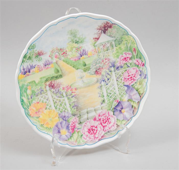 Subasta 1085T, Lote # 323 Lote de 9 piezas. Inglaterra y México. Siglo XX. Elaborados en porcelana. Marca Wedgwood, Gloria, Royal Albert y de Cuernavaca. Consta de: sopera, 3 platos decorativos y 5 hueveras. Decorados con elementos florales, esmalte dorado, abejas, mariposas, reproducción de la obra de Edward Ladell (1821-1886), "The Fountain" reproducción de la obra de Molly Roddis y "A celebration of the Old Country Roses Garden". Presentan manchas, desportilladuras y desgaste. Estimado $800-1,200