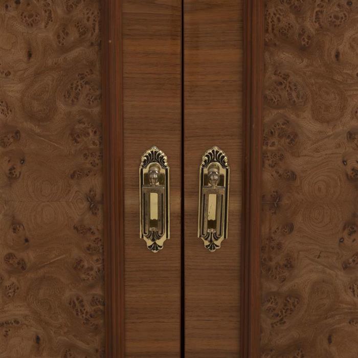 c) Vitrina. A 2 cuerpos. Con 8 puertas abatibles, 4 con cristal biselado, 4 cajones, tiradores de metal dorado y soporte tipo zócalo. Decorada con elementos orgánicos y molduras.