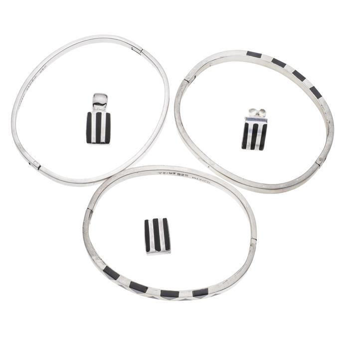 Tres brazaletes, pendiente y par de aretes con ónix en plata .925.