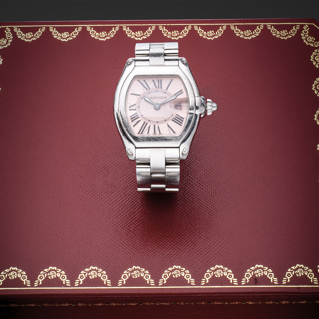 Carátula: rosa con índices de números romanos, marca Cartier oculta en el número X.