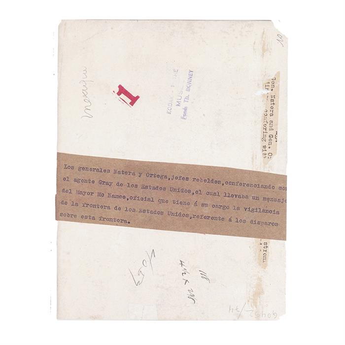 Subasta 1030, Lote # 42 Kodak Phothé Musee Fonds Th. Bonney. Los Generales Pánfilo Natera y Toribio Ortega, Conferenciando con el Agente Gray de los Estados Unidos. Fotografía, 21 x 15.5 cm. Al reverso, sello de propiedad, notas a lápiz y texto mecanografiado: "Los generales Natera y Ortega, jefes rebeldes, conferenciando con el agente Gray de los Estados Unidos, el cual lleva un mensaje del mayor McNamee, oficial que tiene a su cargo la vigilancia de la frontera de los Estados Unidos, referente a los disparos sobre esta frontera (Ojinaga)". En marialuisa. Estimado $6,000-8,000