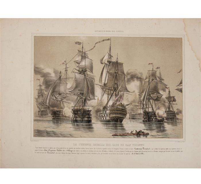 Subasta 1098T, Lote # 55 Urrabieta - Belvedere, Augusto de - Valdivieso. Litografías a color. 31 x 44.5 cm. (6), 31.5 x 43.5 cm., 30 x 45 cm. y 29.5 x 43 cm. Madrid: Lit de J. J. Martínez, 1854 - 1856. a) La Armada Naval Mandada por el Comendador García Loaisa.b) La Funesta Batalla del Cabo de San Vicente (repetida). Una con rasgadura restaurada en margen derecho, afecta poco imagen. c) Combate de Tolon (repetida). d) Combate de Tolon (lámina 2a.). Rasgadura restaurada en margen superior, afecta poco imagen. e) Expedición de Fernando de Magallanes (repetida). Una con pequeñas rasgaduras restauradas en margen superior. f) Ataque por los Ingleses a Buenos Aires. Partida por la mitad, restaurada. Sucias y mancha de humedad en esquina superior derecha. Piezas: 9. Tomadas de la obra: Ferrer de Couto, José - March y Labores, José. Historia de la Marina Real Española. Desde el Descubrimiento de las Américas hasta el Combate de Trafalgar... Estimado $1,000-2,000