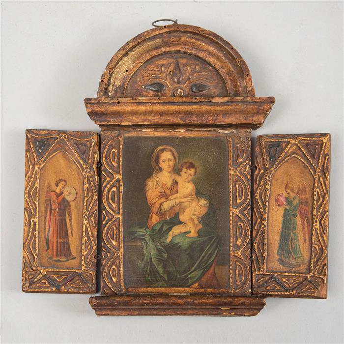 b) Tríptico. Virgen con Niño al centro y ángeles en los laterales. Óleo sobre rígido. Base de madera dorada.