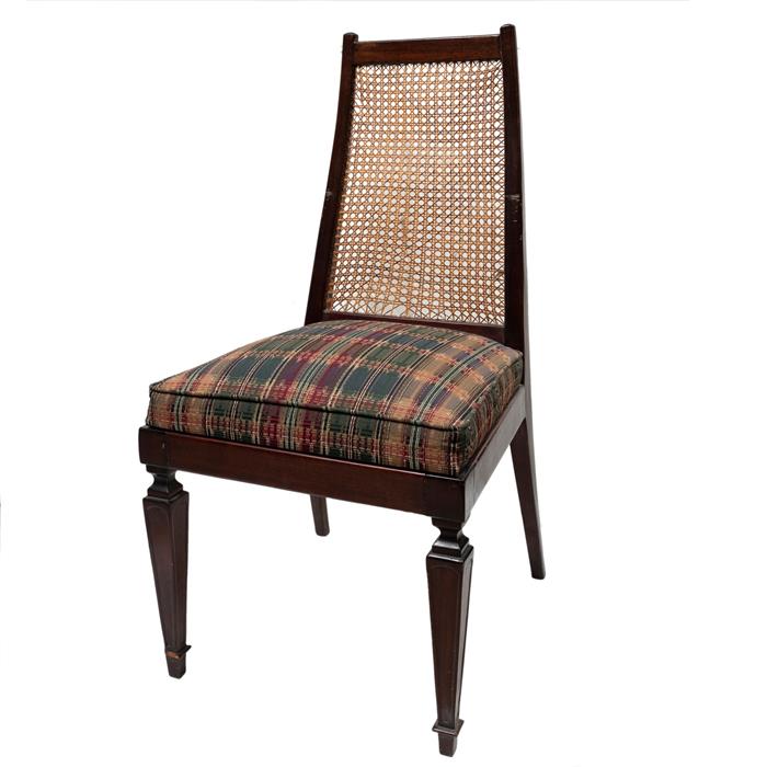 Con asientos textiles, respaldos de bejuco y soportes con molduras.