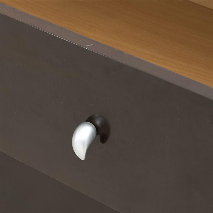 Con cubierta rectangular, cajones con tiradores de metal y soportes rectos.