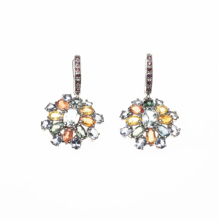 Anillo con peridotos y turmalinas, y par de aretes con aguamarinas y zafiros color amarillo y naranja.