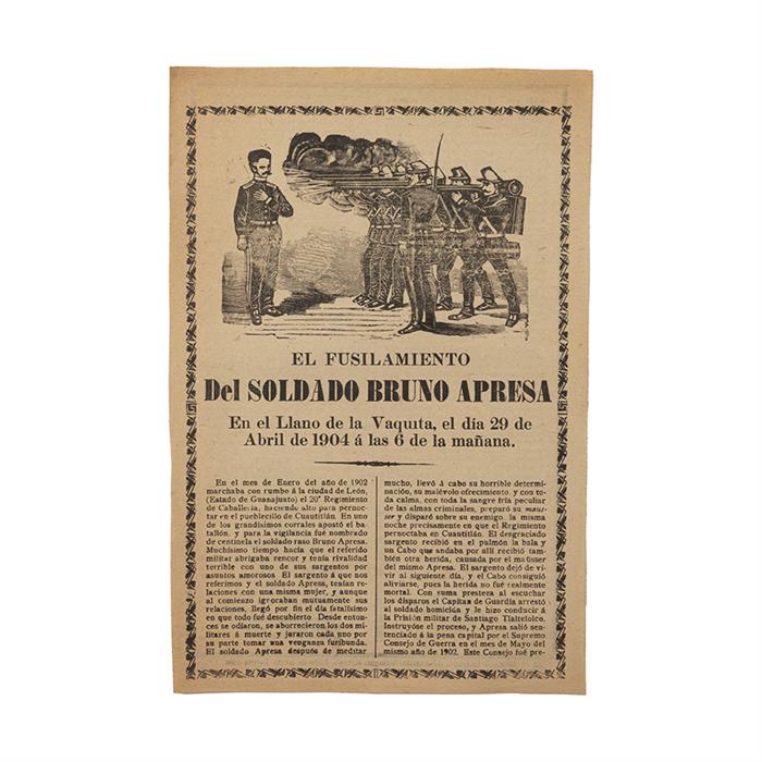 Subasta 1051, Lote # 175 Posada, José Guadalupe. Horrorosas Noticias en Diferentes Estados de la República. Hojas volantes. México: Imp. de A. Vanegas Arroyo, principios del Siglo XX. - ¡Espantosísima y Alarmante Noticia! De una Hija que Asesinó a su Padre y a su Madrastra, en una Población del Estado de Jalisco. - ¡¡Horrible y Espantosísimo Acontecimiento!! Un hijo que Envenena a sus Padres y a una Criada en Pachuca. Terrible Tempestad que se Desarrolla el día 8 del mes pasado (3). - ¡Horrorosa Noticia! Robo Sacrílego y Asesinato del Señor Cura en la Iglesia Parroquial del Pueblo de Zahuaya, Cometido por un Impío llamado Celso Flores. - Terrible y Verdadera Noticia. Del Espantoso Ejemplar Ocurrido con Norberta Reyes, y que cerca de la Ciudad de Zamora Asesinó a sus Padres el día 2 del Mes Pasado del Presente Año (3). - ¡Horripilante Crimen! Una Mujer que Mata a su Hijo en Tacubaya el Sábado 18 de Marzo del Presente Año de 1905! - Muy Interesante Noticia. De los Cuatro Asesinatos Cometidos por el Desgraciado Antonio Sánchez, en el Pueblo de San José Iturbide, Estado de Guanajuato, quien después del Horrible Crimen, se Comió los Restos de su Propio Hijo (2). - ¡Crimen Nunca Visto! Tomás Sánchez, Barbero que está Establecido en Saltillo, Degüella a su Tierna e Indefensa Hija de 11 Años de Edad, Declarando Dicho Individuo haber Cometido Otro Repugnante Crimen en la Persona de la Referida Niña. - Crimen Horrible. Pedro Ortiz que Mata a su Mujer y a Una Nieta de Esta. Su Propio Hijo Aclara el Crimen después de Tres Meses. - ¡Horroroso Asesinato! Acaecido en la Ciudad de Tuxpan el 10 del Presente Mes y Año, por María Antonia Rodríguez que Mató a su Compadre por no Condescender a las Relaciones de Ilícita Amistad. - ¡¡Espantosísimo Crimen!! Dos Niños Extrangulados la Noche del 2 de Diciembre del Presente Año en la Casa núm. 2 de la 1a. Calle de Matías Romero a una Cuadra Antes de la Penitenciaría. - Sensacional Noticia. Los Cinco Asesinatos del Gendarme José Hernández, de la 3a. Demarcación. - ¡Espantoso Crimen Nunca Visto! ¡¡Mujer Peor que las Fieras!! Una Niña con la Ropa Cosida al Cuerpo. - Lamentable y Espantoso Ejemplo. Ocurrido en el Pueblo de La Barca, Estado de Jalisco, el Día 4 de Diciembre del Año Pasado. Juan Ortiz asesinó a su Mujer y a su Anciano Padre. - Espantoso Suceso. Un horroroso Crimen cometido por Pedro Lara en las Personas de sus Padres. Varios formatos, 27.5 x 18 cm., promedio. Seis hojas afectadas por humedad en margen inferior. Piezas: 19. Estimado $10,000-12,000