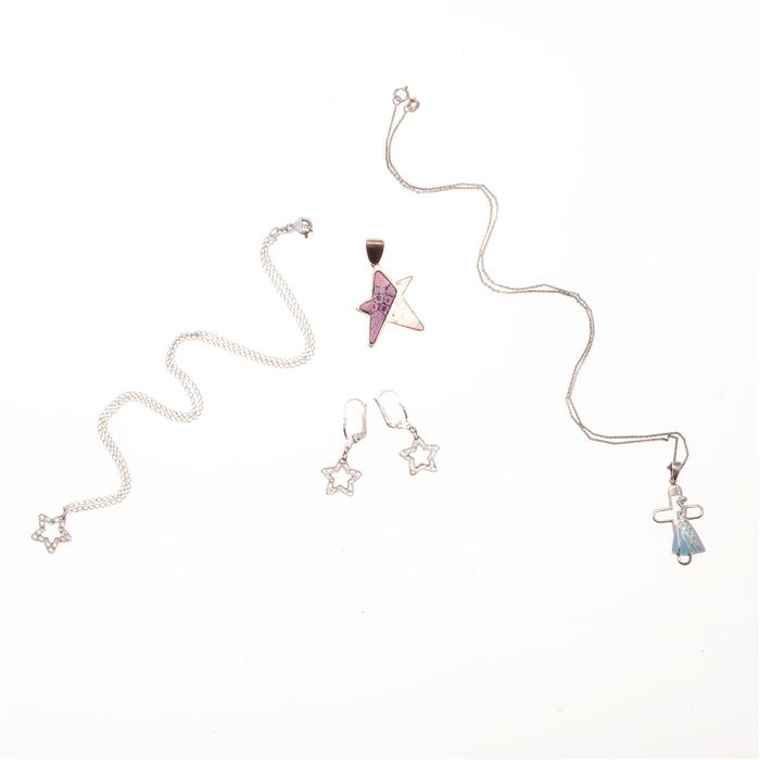 Cuatro anillos, par de aretes, argolla, pulsera, 5 pendinetes y 2 collares con cristal de murano y simulantes en plata .925.