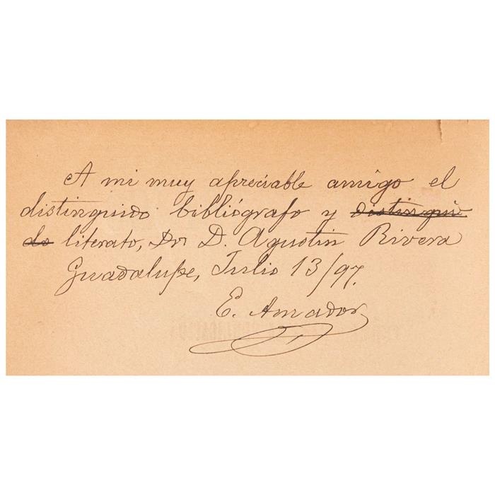 4o. marquilla, V + 663 p. + 1 h. Primera edición arreglada por Elías Amador. Sin refinar. Dedicado y firmado por Elias Amador para Agustín Rivera. Ex Libris de Joaquín Cortina Goribar. Contiene una relación diaria de todos los acontecimientos políticos ocurridos en la Ciudad de México y en otros lugares del país, rasgos biográficos referentes a muchos personajes públicos y multitud de noticias y comentarios sobre diversos asuntos. Abarca esta obra el período transcurrido desde diciembre de 1822 hasta Agosto de 1841. Tomo I (1822 - 1823). Pequeño faltante en portada, punta inferior. Encuadernado en pasta dura, en piel.