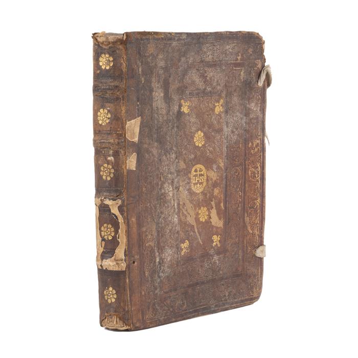 8o. marquilla, 5 h. + 255 p. Ex Libris: Ex Biblioteca Magni Mexicani Conbentus S. P. N. S. Francisci. Portada con notas. Guarda deteriorada. Pastas decoradas, detalles en dorado. Encuadernado en pasta dura, en piel.