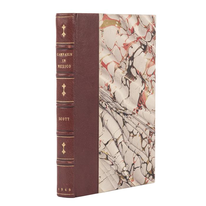 Subasta 1077, Lote # 141 Moore, H. Judge. Scott's Campaign in Mexico; from the Rendezvous on the Island of Lobos, to the Taking of the City, Including an Account of the Siege of Puebla, with Sketches of the Country, and Manners and Customs of the Inhabitants. Charleston: J. B. Nixon, Publisher, 1849. 8o. marquilla, XII + 234 p. Primera edición. Texto con manchas de humedad. Encuadernado en pasta dura, lomo en piel. Sabin: 50386. Garrett y Goodwin, página. 163: "Moore apoyó la guerra y las contribuciones hechas por los sureños". Howes M769: "Narrativa de un testigo presencial; notable por el crédito dado a Santa Anna". Estimado $4,000-6,000