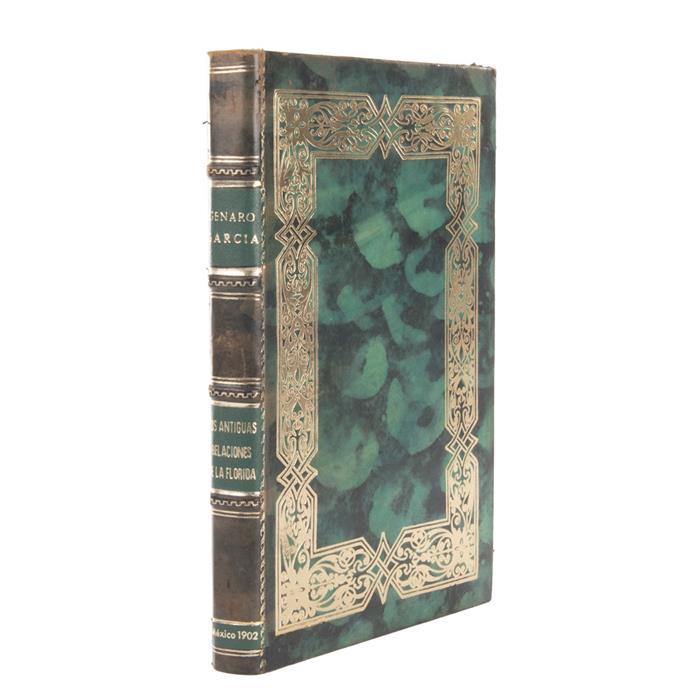 Subasta 1077, Lote # 165 García, Genaro. Dos Antiguas Relaciones de La Florida, Publicadas por Primera Vez. México: Tip. y Lit. de J. Aguilar Vera y Comp., 1902. 4o. marquilla, CII + 226 p. Edición de 500 ejemplares, 30 de ellos en papel fino y numerados, ejemplar sin numerar. Conserva pasta anterior original en rústica, rasgada en tercio superior. Encuadernado en pasta dura, en piel. "…dos interesantes relaciones inéditas… la Vida y Hechos de Pedro Menéndez de Avilés, compuesta en 1568 por Bartolomé Barrientos… es la historia más autorizada que yo conozca, de la expedición que envió a la Florida Felipe II en 1565… la otra, o sea la Relación de los Trabajos que la Gente de una Nao Llamada Ntra. Sra. de la Merced Padeció, escrita varios años después por FRAY Andrés de San Miguel…". Véase en: Advertencia, páginas III y IV. Estimado $4,000-6,000