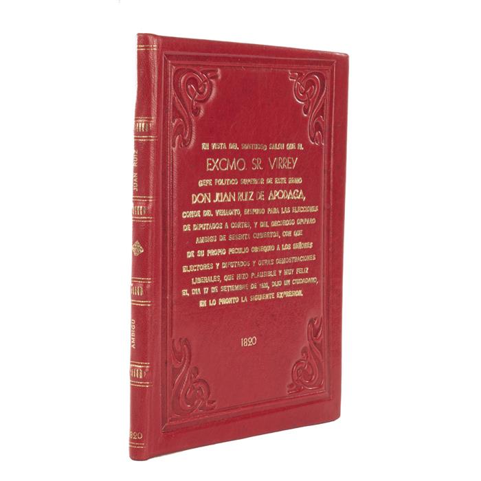 Subasta 1077, Lote # 166 En Vista del Suntuoso Salón que el Exmo, Sr. Virey Gefe Politico Superior de este Reino Don Juan Ruiz de Apodaca, Conde del Venadito, Dispuso para las Elecciones de Diputados a Cortes y del Decoroso Opíparo Ambigú de Sesenta Cubiertos, con que de su propio Peculo, Obsequio a los Señores Electores y Diputados y otras Demostraciones Liberales, con que hizo Plausible y muy Feliz el día 17 de Setiembre de 1820, dijo un Ciudadano en lo pronto la Siguiente Expresión. México: Imprenta de D. Juan Bautista de Arizpe, 1820. 8o. marquilla, 11 p. Encuadernado en pasta dura. El día 17 de septiembre de 1820, en la Nueva España se comenzaron a celebrar las elecciones provinciales para elegir a los diputados que se enviaron a las Cortes Españolas. Estimado $10,000-12,000
