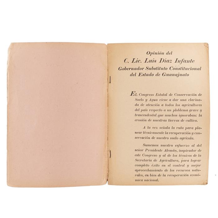 Memoria del Primer Congreso Estatal de Conservación del Suelo y Agua que se Celebró en la Ciudad de Celaya, Guanajuato los días 17, 18 y 19 de diciembre de 1948. Guanajuato: Imprenta del Estado, 1948. 4o. marquilla, 106 p. Ilustrado. Lomo rasgado, sin pie. Pastas en rústica, engrapado.