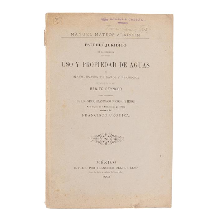Mateos Alarcón, Manuel.Estudio Jurídico de la Demanda que sobre Uso y Propiedad de Aguas é Indemnización de Daños y Perjuicios Promovió el Sr. Lic. Benito Reynoso como Apoderado de los Sres. Francisco G. Cosio y Hnos. Ante el Juez de 1a. Instancia de Quere´taro contra el Sr. Francisco Urquiza. México: Impreso por Francisco Díaz de León, 1902. 4o. marquilla, 67 p. Pasta posterior manchada. Encuadernado en rústica. Defensa del Sr. Francisco Urquiza que hace el Lic. Manuel Mateos, por la indemnización que le piden el gobernador del Estado Francisco G. Cosío y sus hermanos. Véase en: Bibliografía Histórica y Geográfica de Querétaro, edición en línea.