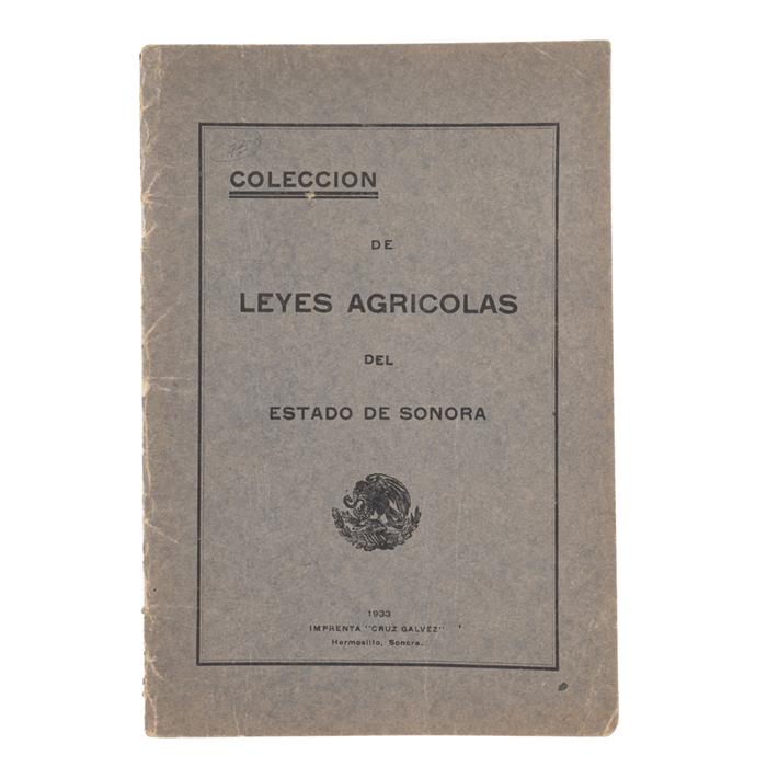 Calles, Rodolfo Elías.Colección de Leyes Agrícolas del Estado de Sonora. Hermosillo, Sonora: Imprenta "Cruz Galvez", 1933. 8o. marquilla, 40 p. Encuadernado en rústica.