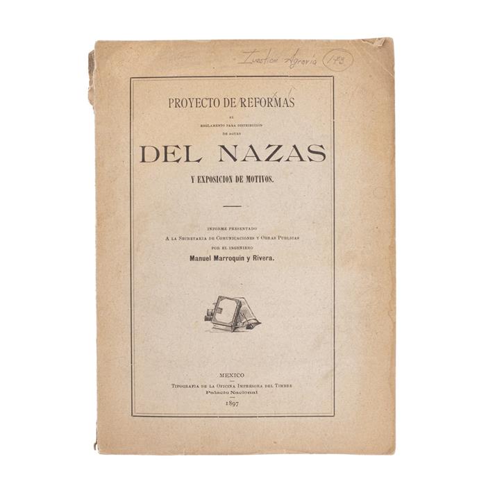 Marroquín y Rivera, Manuel. Proyecto de Reformas al Reglamento para Distribución de Aguas del Nazas y Exposición de Motivos. México: Tipografía de la Oficina Impresora del Timbre, 1897.