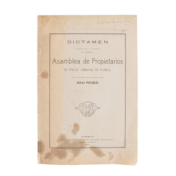 Dictamen Emitido por la Comisión que Nombró la Asamblea de Propietarios de Fincas Urbanas de Puebla, para el Impuesto sobre Aguas Potables. Puebla: Imprenta, Encuadernación, Rayado y Realzado "El Escritorio", 1911. 8o. marquilla, 24 p. Pasta anterior a página 13 con manchas de humedad en tercio inferior, afecta poco texto. Pasta posterior por desprenderse. Encuadernado en rústica.