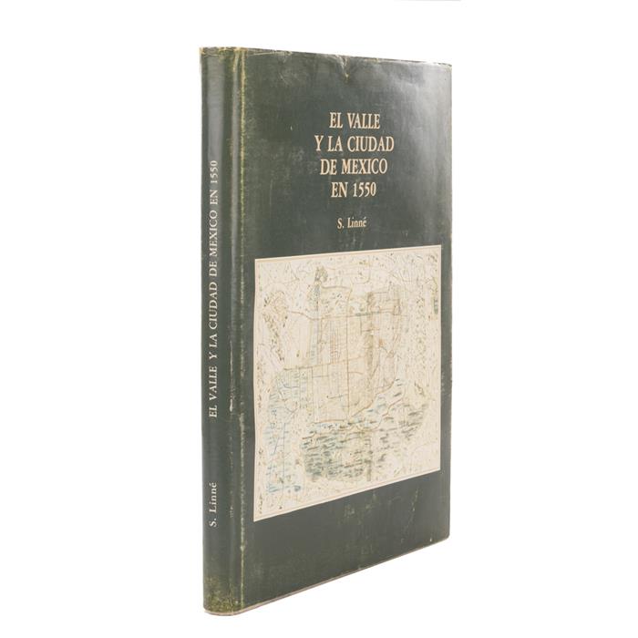 Subasta 1081, Lote # 253 Linné, S. El Valle y la Ciudad de México en 1550. Relación Histórica Fundada sobre un Mapa Geográfico, que se Conserva en la Biblioteca de la Universidad de Uppsala, Suecia. México: SEDUE / Museo Etnográfico de Estocolmo Suecia, 1988. 4o. marquilla, 220 p. + 1 h. + 12 mapas. Segunda edición (Facsimilar de la primera). Edición de 1,000 ejemplares. Al final, un mapa plegado, a color "Ciudad de México y alrededores, 1550. Mapa dibujado a mano sobre pergamento por alonso de Santa Cruz", en sobre. Encuadernado en pasta dura. Estimado $4,000-5,000