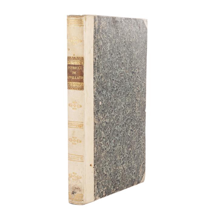 Petricca a Sonnino, Angelo. De Appellationibus Omnium Ecclesiarum ad Romanam S. Petri Cathedram. Adversus huius temporis haereticos & schismaticos. Romae: Apud Franciscum Albertum Tanum, 1649. 4o. marquilla, 3 h. + 111 + 206 p. + 10 h. Opus recens, nunc primo compositum. Liber Primus Appellationibus in Genere - Liber Secundus de Appellationibus in Specie. Viñeta de media página en portada. Notas manuscritas al margen, texto subrrayado y con tachaduras, en el libro primero. Márgenes recortados; surcos de polilla en punta superior. Encuadernado en pasta dura, lomo y puntas en pergamino. Estimado $2,000-3,000