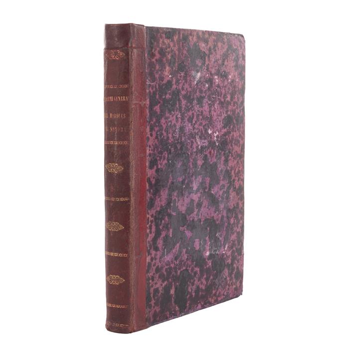 Subasta 1081, Lote # 33 Gálvez, José (Marqués de Sonora). Informe General, que en Virtud de Real Orden instruyó y entregó el Excmo. Sr. Marqués de Sonora siendo Visitador General de este Reyno al Excmo. Sr. Virrey Frey D. Antonio Bucarely y Ursúa con fecha de 31 de Diciembre de 1771. México: Imprenta de Santiago White, 1867. 4o. marquilla, 411 p. Con 23 cuadros plegados (estados, extractos y documentos). Se arregló y enquadernó siendo Secretario del Virreynato el Coronel de Dragones Antonio Bonilla. Encuadernado en pasta dura, lomo en piel. Informe sobre la situación de las provincias del Reino de la Nueva España en materia de Justicia y de Hacienda, y sobre las expediciones realizadas por José de Gálvez a las Provincias Internas, a las Californias y Sonora. Incluye copia de los documentos que se citan en el informe. José de Gálvez fue el principal impulsor de la división de los territorios del virreinato en intendencias, proyecto al cual se opuso en su momento el Virrey Antonio Bucarely y Ursúa. Estimado $8,000-10,000