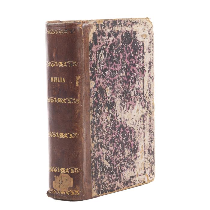 Biblia Sacra Vulgatae Editionis Sixti V Pont Max Iussu Recognita: et Clementis VIII. Lugduni: Sumptib Haered Guil Rouillij, 1609. 16o. marquilla, 831 p. + 30 h. Portada grabada. Cantos gastados, con faltantes. Refinado en margen superior. Ex Libris de antiguo propietario. Encuadernado en pasta dura, lomo en piel.