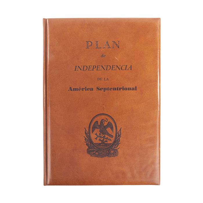fo. marquilla, 8 h. Facsimilar. "Consta esta edición facsimilar del "Plan de Iguala" de un ejemplar impreso en papel de la época, destinado al C. PRESIDENTE DE LA REPÚBLICA, LICENCIADO GUSTAVO DÍAZ ORDAZ y de DIECINUEVE ejemplares impresos en papel Fairfield Wedding de 50.8 Kilogramos, destinados: TRES DE MÉXICO, DOCE, a los miembros de su consejo consultivo y CUATRO para obsequio a los invitados de honor a la IVa.Reunión de dicho consejo…". Encuadernado en pasta dura, en piel. En carpeta, grabada con el nombre de Antonio Carrillo Flores, Secretario de Relaciones Exteriores (1964-1970).