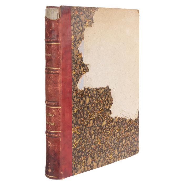 García Cubas, Antonio.Cuadro Geográfico, Estadístico, Descriptivo é Histórico de los Estados Unidos Mexicanos. México: Oficina Tip. de la Secretaría de Fomento, 1884. 8o. marquilla, IV + 474 + III p. + 1 h. Dos láminas y dos tablas plegadas. Primera edición. Introducción de Alfonso Lancaster Jones. Pasta anterior son faltantes. Encuadernado en pasta dura, lomo y puntas en piel. Obra escrita para ser distribuida en la Exposición Universal de Nueva Orleans, con la finalidad de dar a conocer, las riquezas naturales de la República Mexicana y el progreso cultural de la Nación.