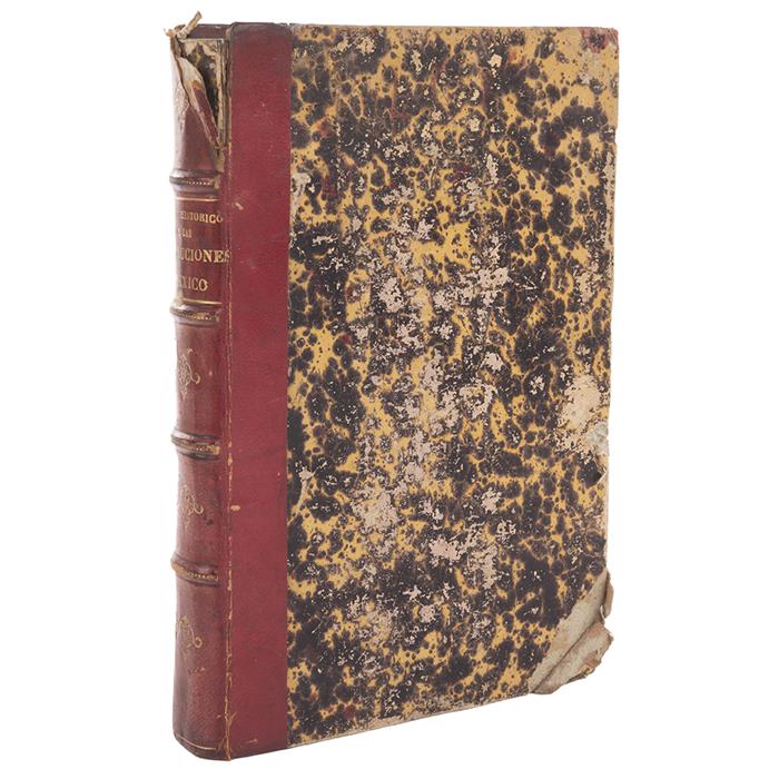 Subasta 1081, Lote # 332 Zavala, Lorenzo de. Ensayo Histórico de las Revoluciones de Mégico, desde 1808 hasta 1830. París: Imprenta de P. Dupont et G. Laguionie, 1831. 8o. marquilla, 443 p. Tomo I. Texto y pastas con manchas de humedad. Pastas y lomo gastados, con faltantes. Encuadernado en pasta dura, lomo en piel. Palau: 378346. Primera edición, rarísima. El autor fue testigo presencial de los hechos. Sabin 106277. Streeter 1128. El "Ensayo Histórico" es sin duda, una de las crónicas más importantes y mejor logradas sobre la guerra de la revolución de la Nueva España. Escrita a partir de las experiencias del propio Zavala, y de un minucioso estudio de documentos de la época, el autor indaga en las causas que favorecieron e instigaron el deseo de independencia de los pueblos americanos; analiza los primeros movimientos revolucionarios, sus principios y su ruina; sigue los pasos del cura Hidalgo y de los principales cabecillas insurgentes hasta la consumación de la independencia. Finalmente, desarrolla las incesantes disputas por el poder, y las sucesivas sublevaciones que atentan contra el orden y la cohesión de la naciente nación mexicana. Estimado $3,000-4,000