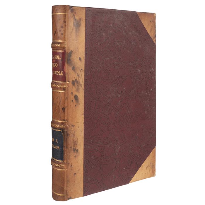 Subasta 1081, Lote # 389 Tablada, José Juan. Al Sol y Bajo la Luna. París - México: Librería de la Viuda de Ch. Bouret, 1918. 8o. marquilla, 240 p. Primera edición. Prólogo de Leopoldo Lugones; portada de Jorge Enciso; kalograma de Torres Palomar. Ex libris de Francisco Lerdo de Tejada. Papel frágil y quebradizo, primeras hojas rasgadas en márgenes y mancha de humedad en margen interno. Encuadernado en pasta dura. José Torres Palomar (1873 - 1920), ingeniero civil y arquitecto de formación, murió en la ciudad de Nueva York a finales de 1920. Buena parte del empeño artístico de Torres Palomar quedó en algo que él llamó kalogramas, diseños originalísimos que trabajó en Nueva York durante la segunda década del siglo 20. "Un kalograma", explicó Torres Palomar, "es la imagen psicológica de un individuo expresada en colores, por medio de las letras de su nombre". Kalograma significa letras bellas, pero el objeto de Torres Palomar no sólo era hacer la combinación de las letras tan bella como fuera posible, "sino conferirles un sentido". Y añadió: "En cada uno de los grupos ordenados armoniosamente, hay pues alguna característica o peculiaridad de la persona, que me sirvió de inspiración". https://vlex.com.mx Estimado $6,000-8,000