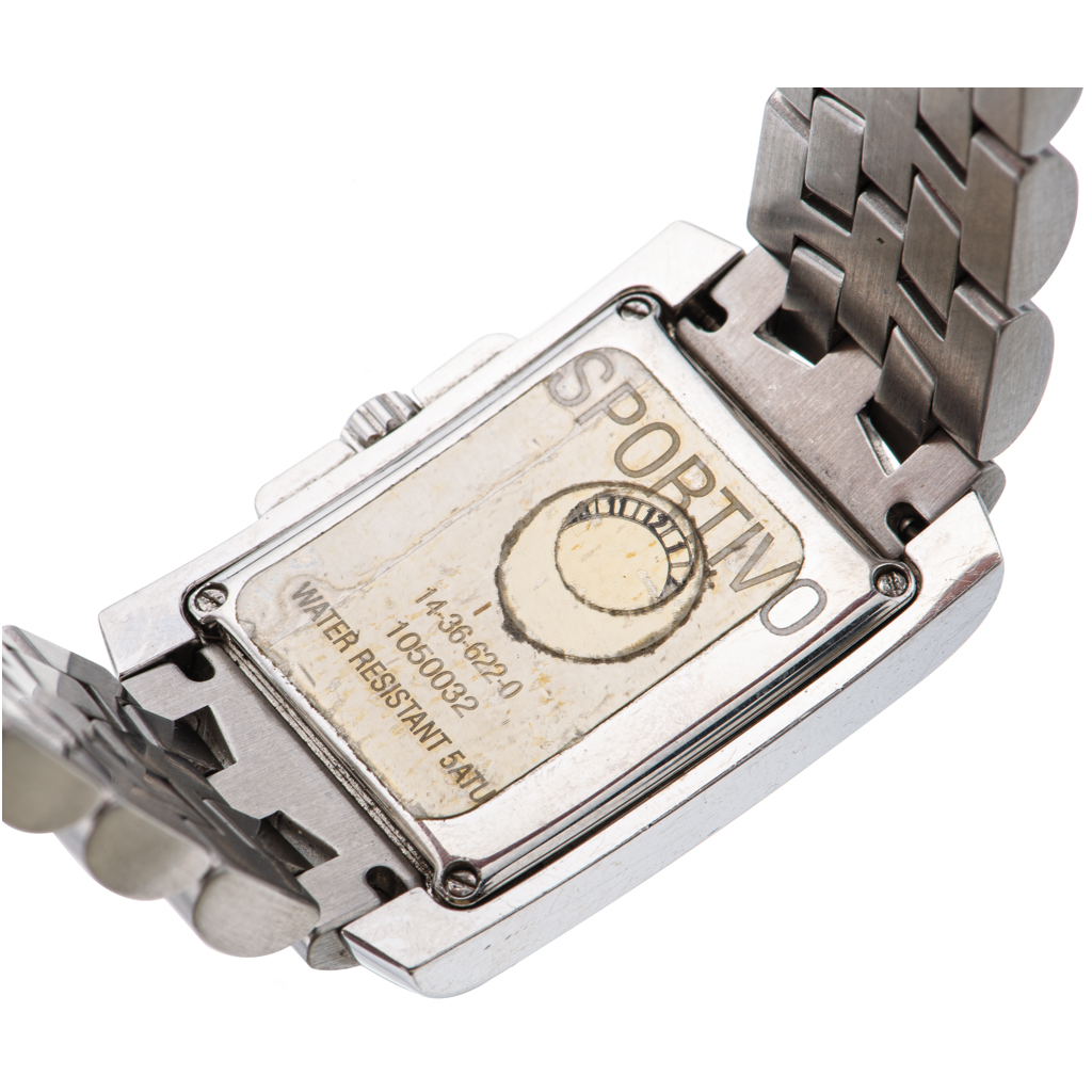 Movimiento: cuarzo. Calibre: ETA 956112 Serie: 105XXXX Caja: rectangular de 26 x 28 mm en acero. Cristal. Carátula: plateada con índices de números arábigos y barras. Funciones: fechador. Pulso: brazalete en acero con doble broche de tijera.