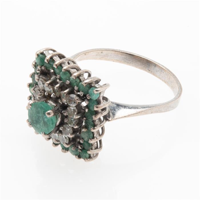 Anillo vintage con esmeraldas y diamantes en plata paladio.
