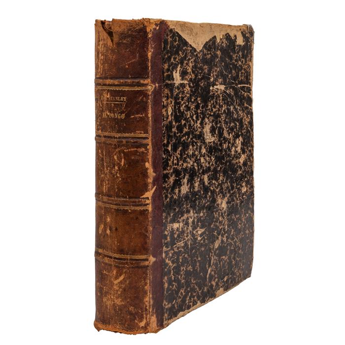 Subasta 0051L, Lote # 301 Stanley, Enrique M. El Congo y la Creación del Estado Independiente de este Nombre. Barcelona: Espasa y Compañía, Editores, ca. 1890. 4o. marquilla, XXIV + 887 p. Historia de los trabajos y exploraciones verificados por Enrique M. Stanley. Espléndida edición adornada con magníficos cromos, láminas sueltas, numerosos grabados intercalados en el texto y varios mapas en negro e iluminados. 25 láminas en negro; Frontispicio y cinco láminas en color. Pastas y lomo deteriorados, con faltantes. Encuadernado en pasta dura, lomo en piel. Estimado $4,000-6,000