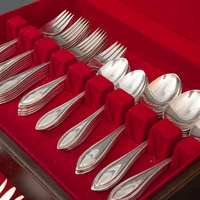 Consta de: 12 cuchillos para carne, 12 tenedores para carne, 12 tenedores para pesado, 12 cucharas soperas, 12 cucharas para postre, 5 servicio; con estuche de madera, detalles de conservación y faltante