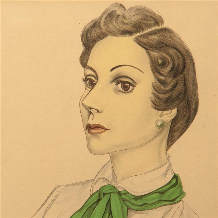 Subasta 1205T, Lote # 205 TSUGUHARU FOUJITA (Tokio, Japón, 1886 - Zúrich, Suiza, 1968) Madame Conchita Montes Firmada y fechada Madrid 1951 en plancha Litografía sin número de tiraje Enmarcada. Esta obra se trata de un retrato de la actriz española María de la Concepción Carro Alcaraz, conocida como Conchita Montes, quién interpretó numerosas obras de teatro y películas de gran éxito como "Correo de Indias, 1942", "La vida en un hilo, 1945", "El último caballo, 1950" y "Mi calle, 1960", entre otras. Fuente consultada: LIES, Elaine. "Nearly 40 works by Japanese artist Leonard Tsuguharu Foujita found by museum". Art Daily, septiembre de 2011, www.artdaily.org 31.4 x 22.2 cm medidas totales Estimado $20,000-30,000